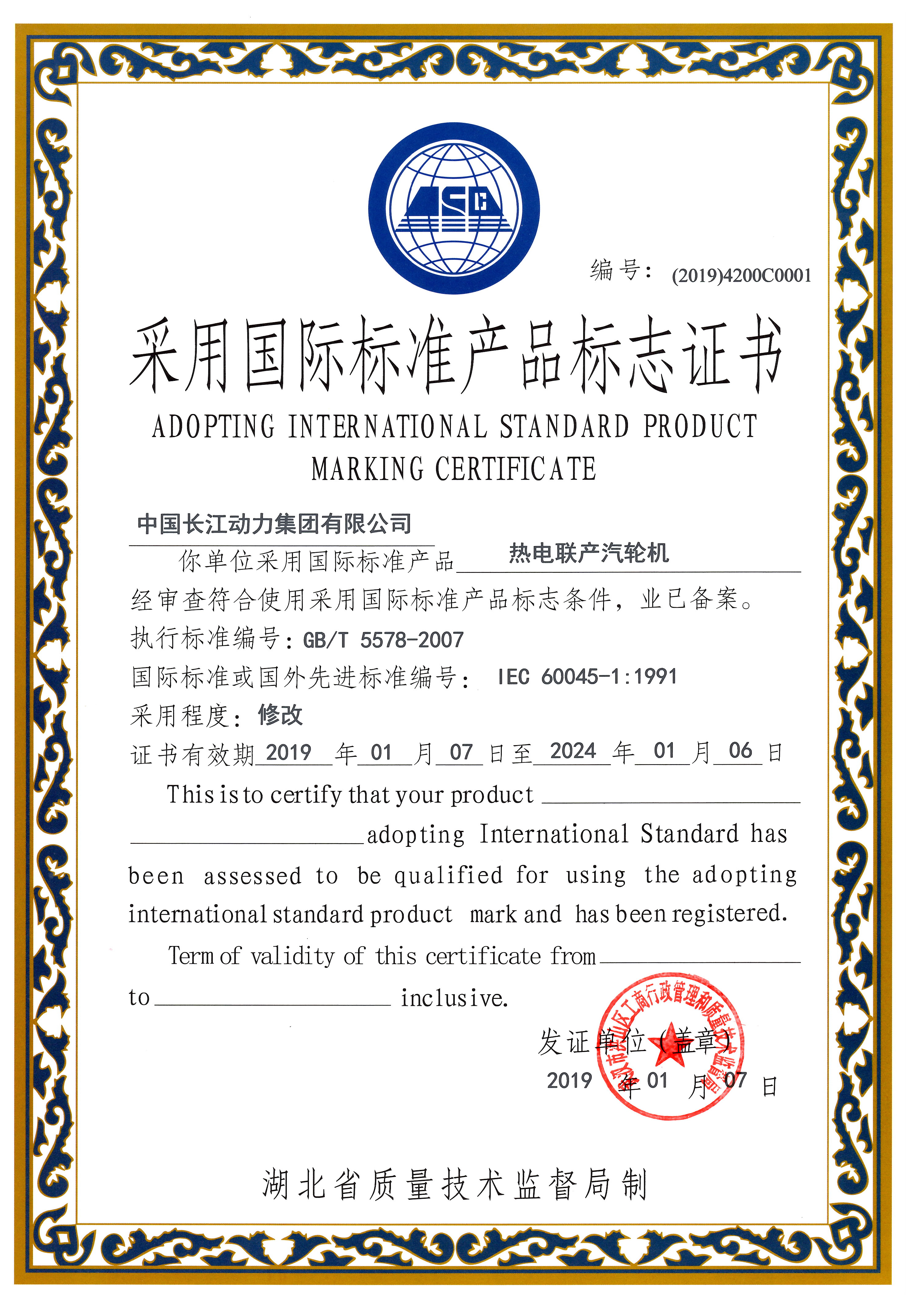 中国bwin必赢集团采标标志证书汽轮机